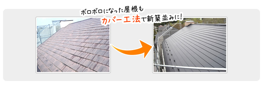 素材の状態が良い場合は、塗装だけで問題ありませんが、劣化が激しい場合は、カバー工法という新しい屋根を取り付ける方法などがあります。